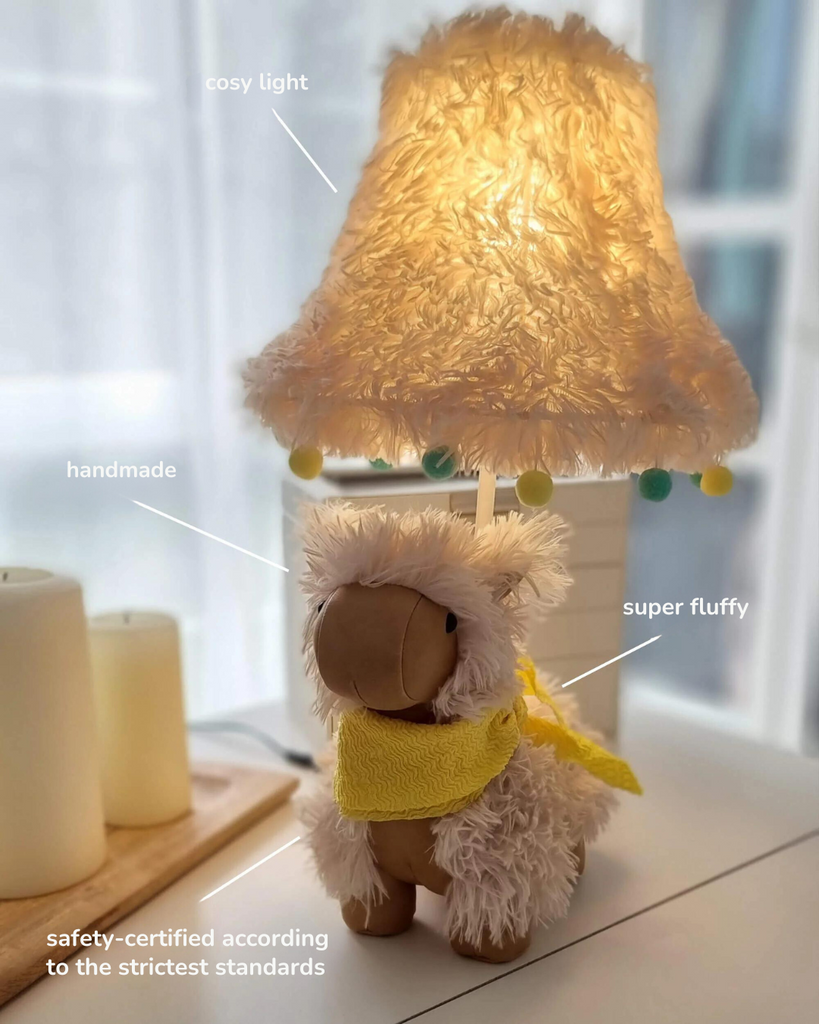 Alma onderscheidt zich van alle andere lampen door haar unieke pluizige stof. Dankzij haar beige kleur past ze perfect in alle kamers. Haar pluizige vacht in combinatie met haar kraaloogjes en schattige sjaal tovert een glimlach op ieders gezicht, groot of klein. Bovendien zorgt de unieke lampenkap voor een bijzonder gezellige lichtkleur.