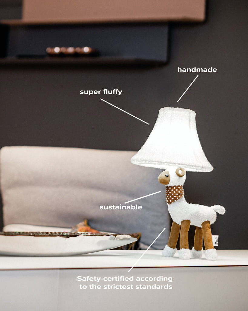 Wolle draagt een sjaal met stippen, een goede stijl hebben vindt hij belangrijk. Zijn hele lijf is zacht en pluizig, net als zijn lampenkap en voeten. De pomponstaart maakt zijn schattige verschijning helemaal af. Met zijn zachte uiterlijk zal Wolle in een mum van tijd je hart veroveren.